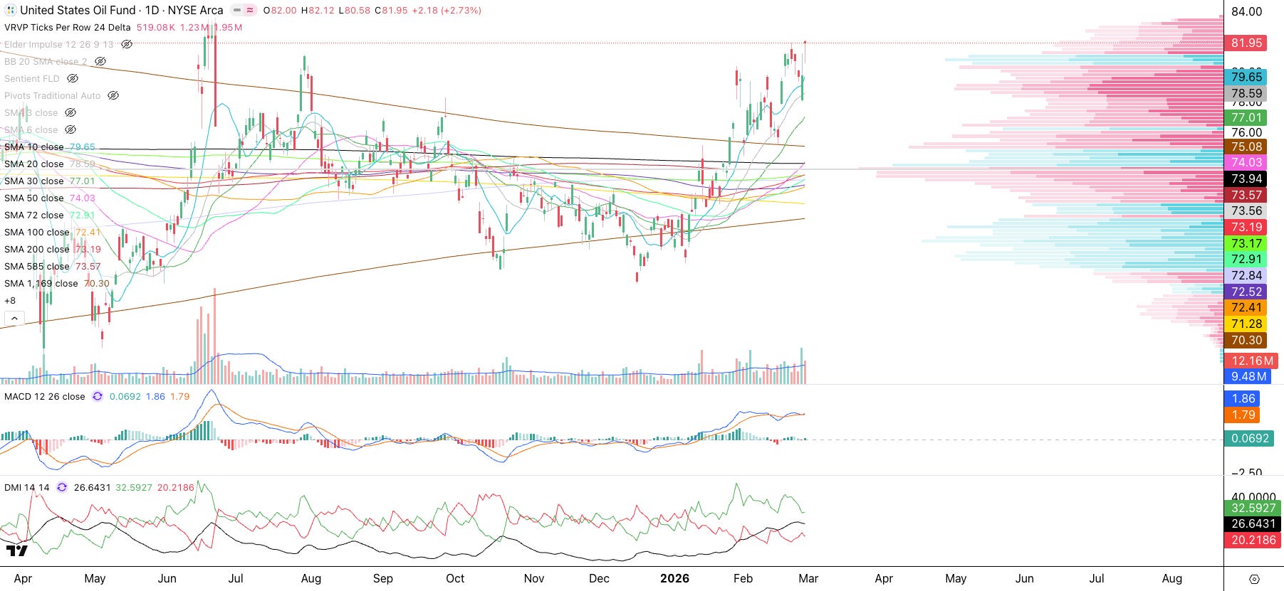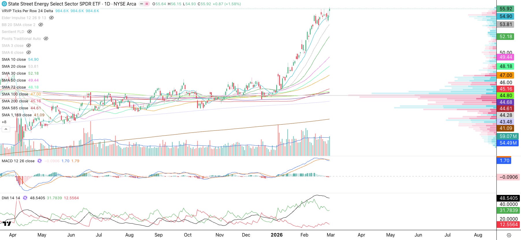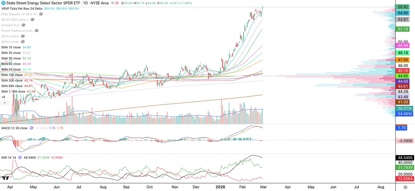 Energy (XLE): Energy is taking off above all moving averages. Notice how it was accumulated all of last year near the POC around $44. Wall Street is really in a profitable situation with this ETF.