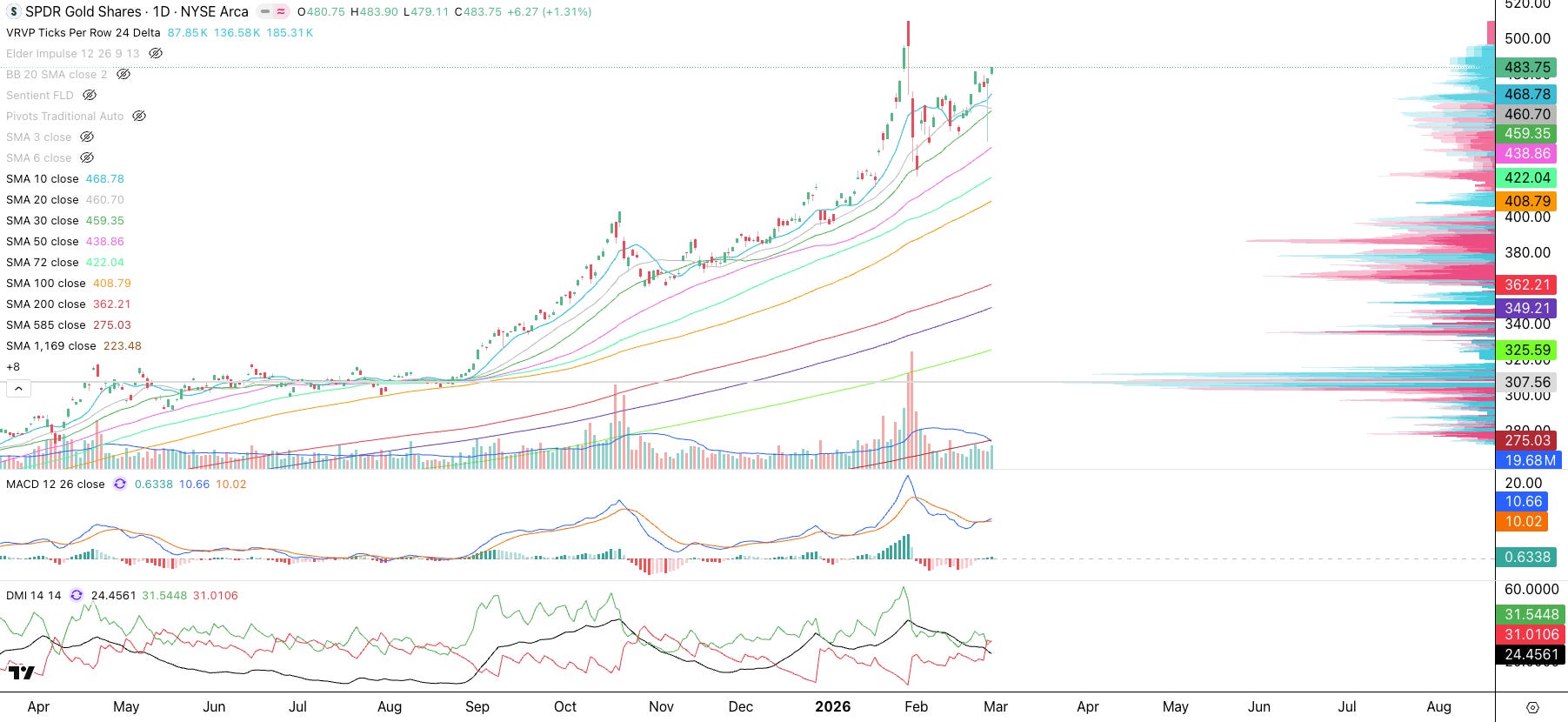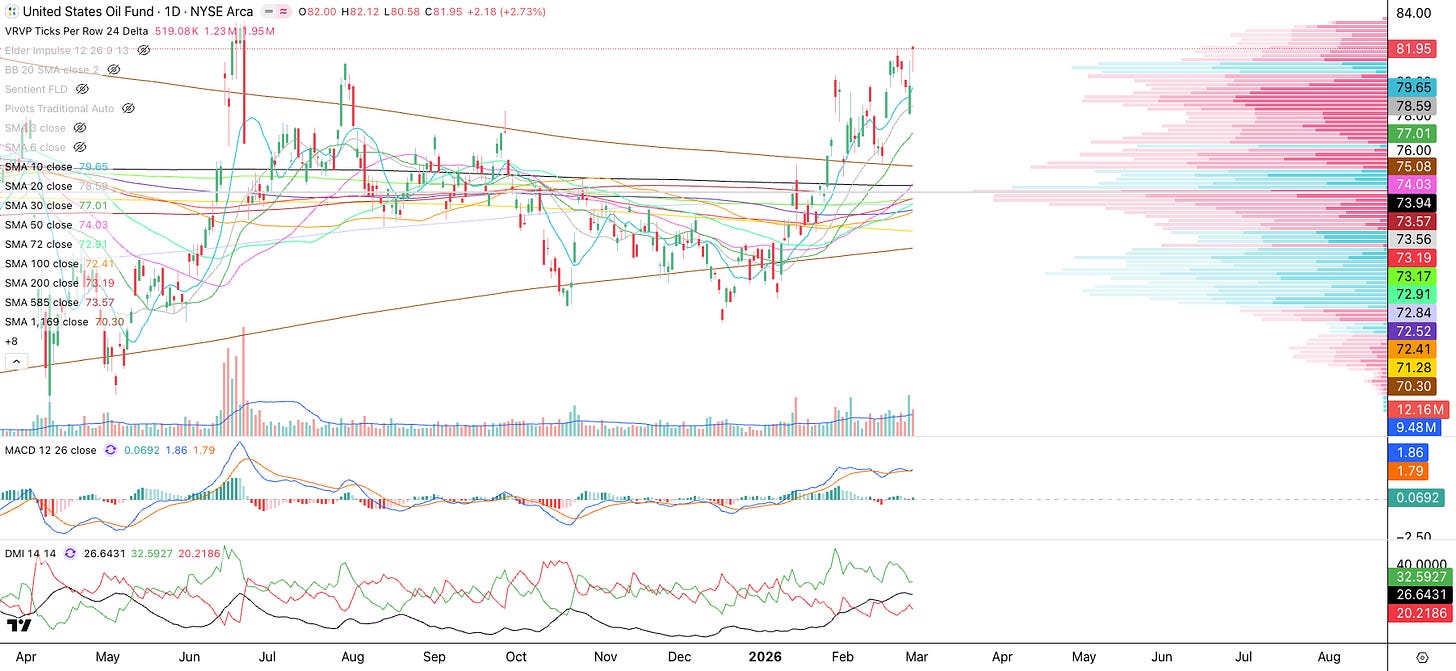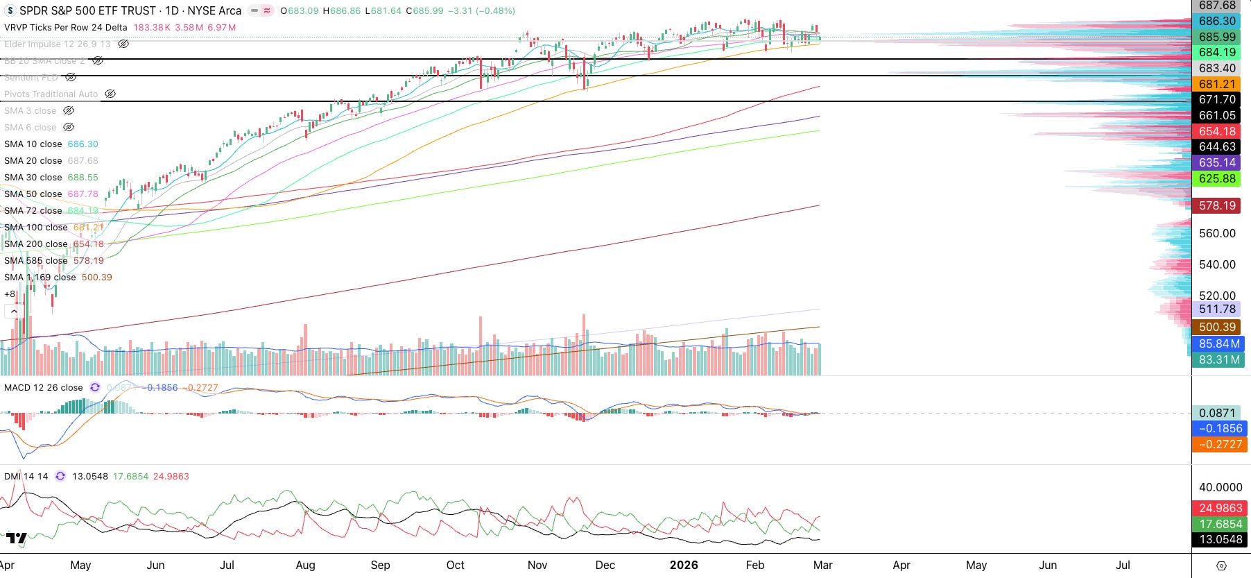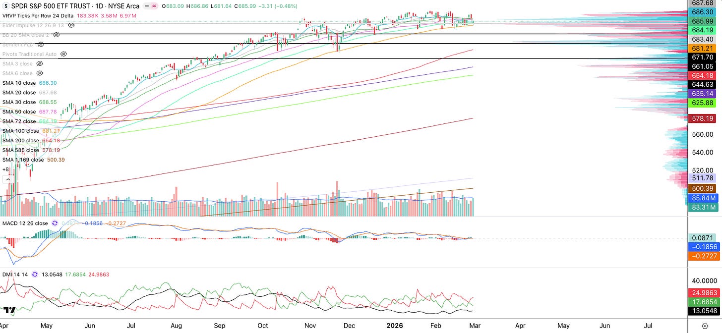 Let’s analyze the market using the Cycles SMA system and Volume Profile. The S&P 500 (SPY) closed the week just above the 100 SMA (orange) and the Volume Profile Point of Control (“POC,” where most shares traded). The 100 SMA has served as support, with the market bouncing off it since November 2025. We know the US attacked Iran this weekend, and this geopolitical exogenous event may be the tipping point that pushes the market into a pullback. Technically, traders who have been buying the dips to the 100 SMA could get stopped out, potentially triggering a rush of sell orders that pushes the market lower at Monday’s open. The market will likely gap down Monday morning. Here are the next support levels: