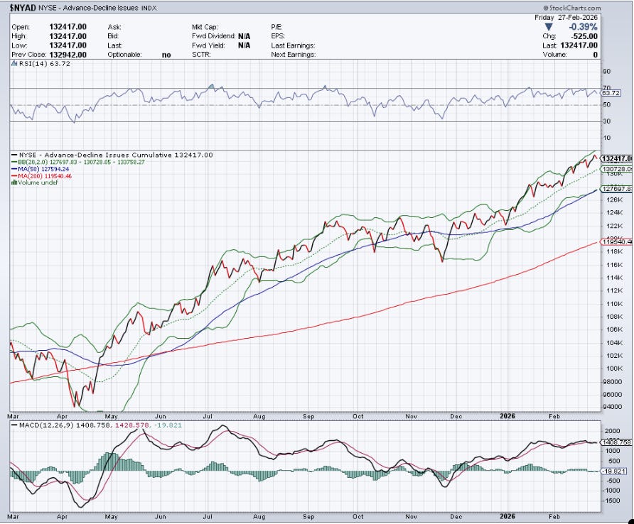 The NYSE Advance/Decline Line ($NYAD) is heading higher on the 20 SMA and is providing support to the broadening out rally thesis.