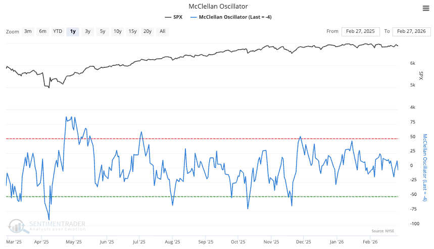The McClellan Oscillator is similarly chopping in the middle of the range…