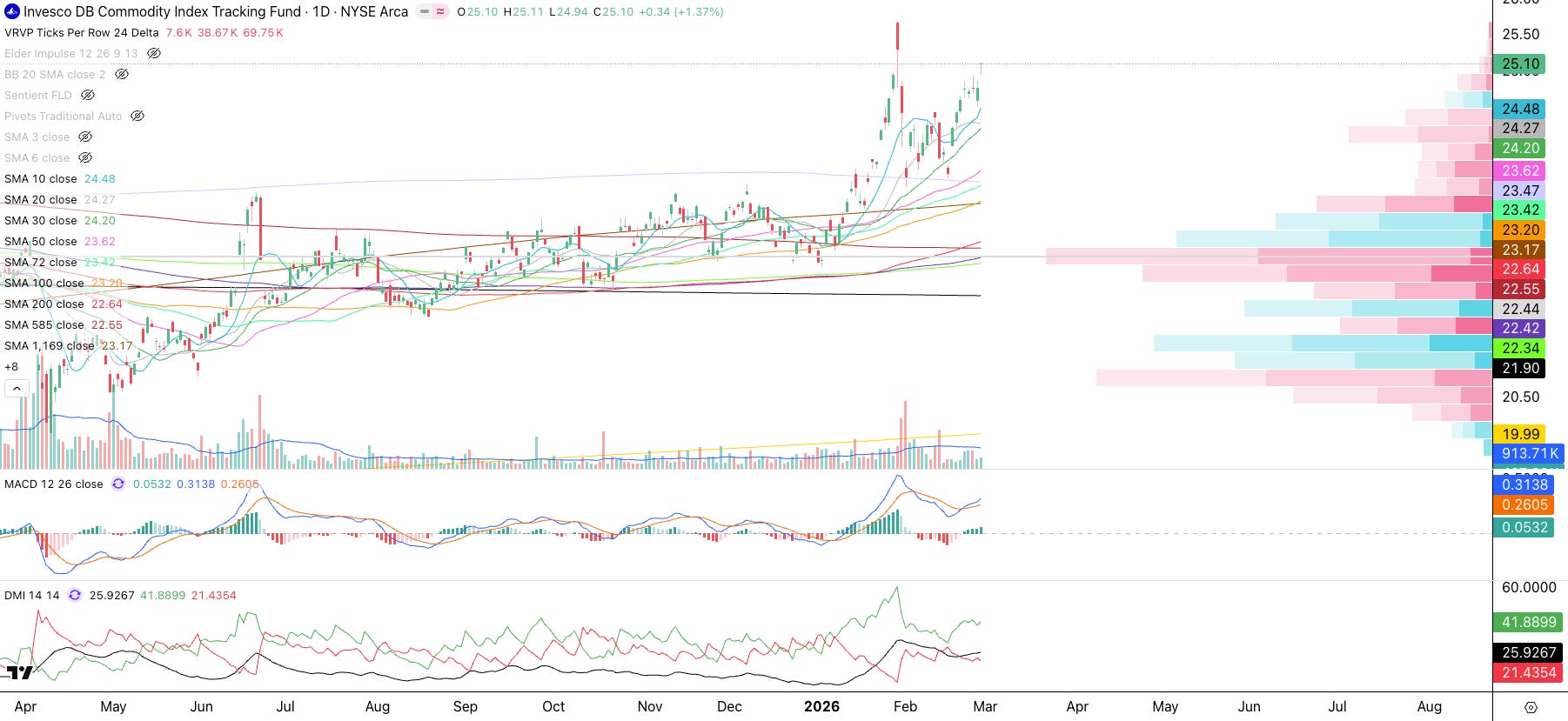 Commodities (DBC): The commodities index has a similar look, trending above all moving averages.