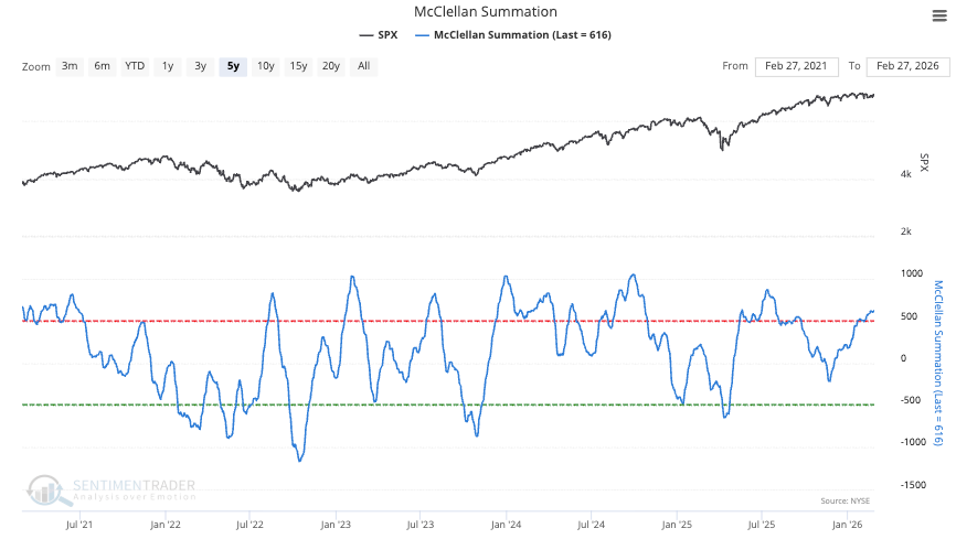 …however the McClellan Summation Index (longer-term breadth momentum indicator) is still up-trending. It is in the “overbought” area, but so long as it trends upwards, breadth is supportive of the market.