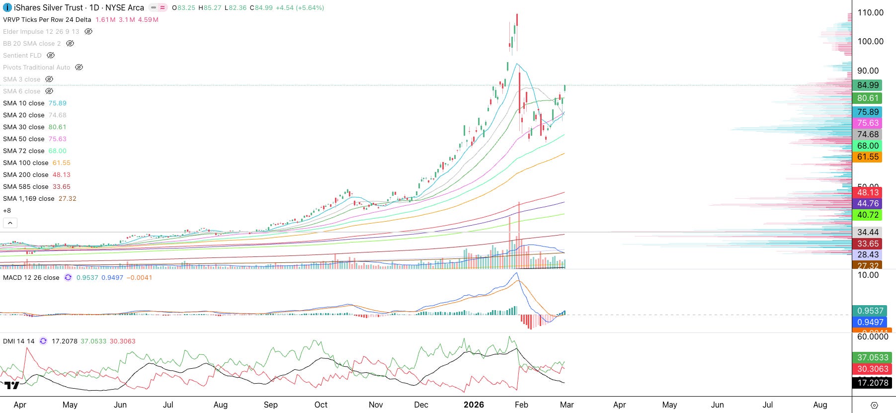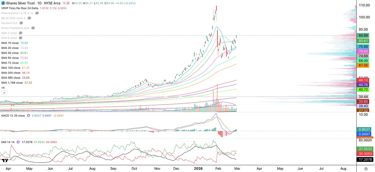 Silver (SLV): Silver had a deeper pullback as it tested the 72 SMA (mint). Nonetheless, it appears ready to test or break recent highs.
