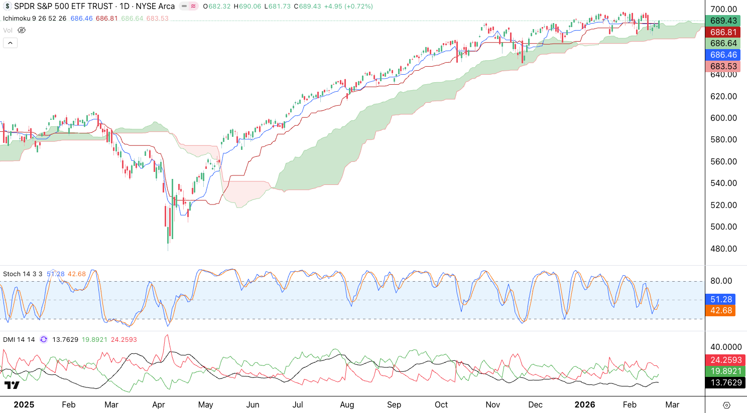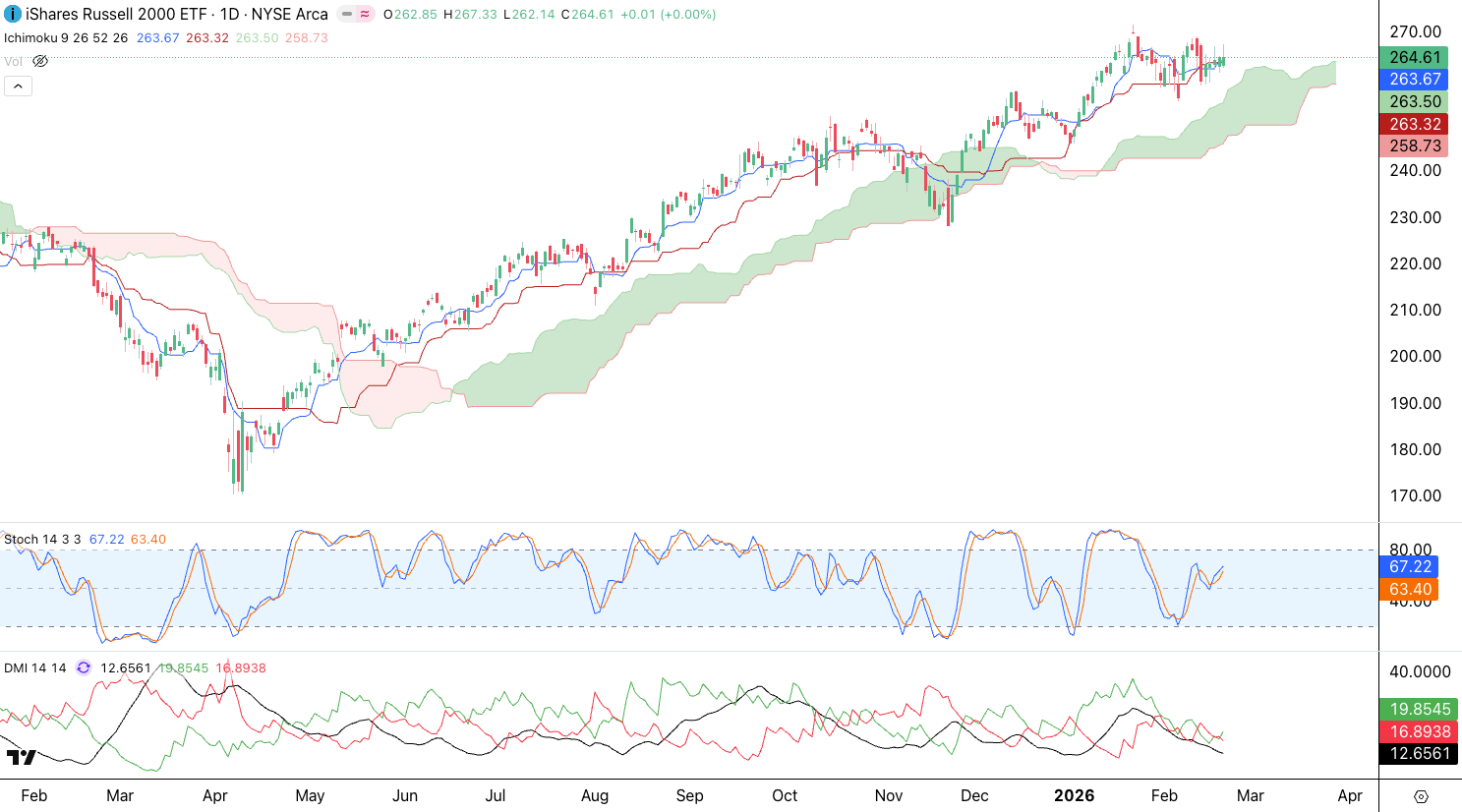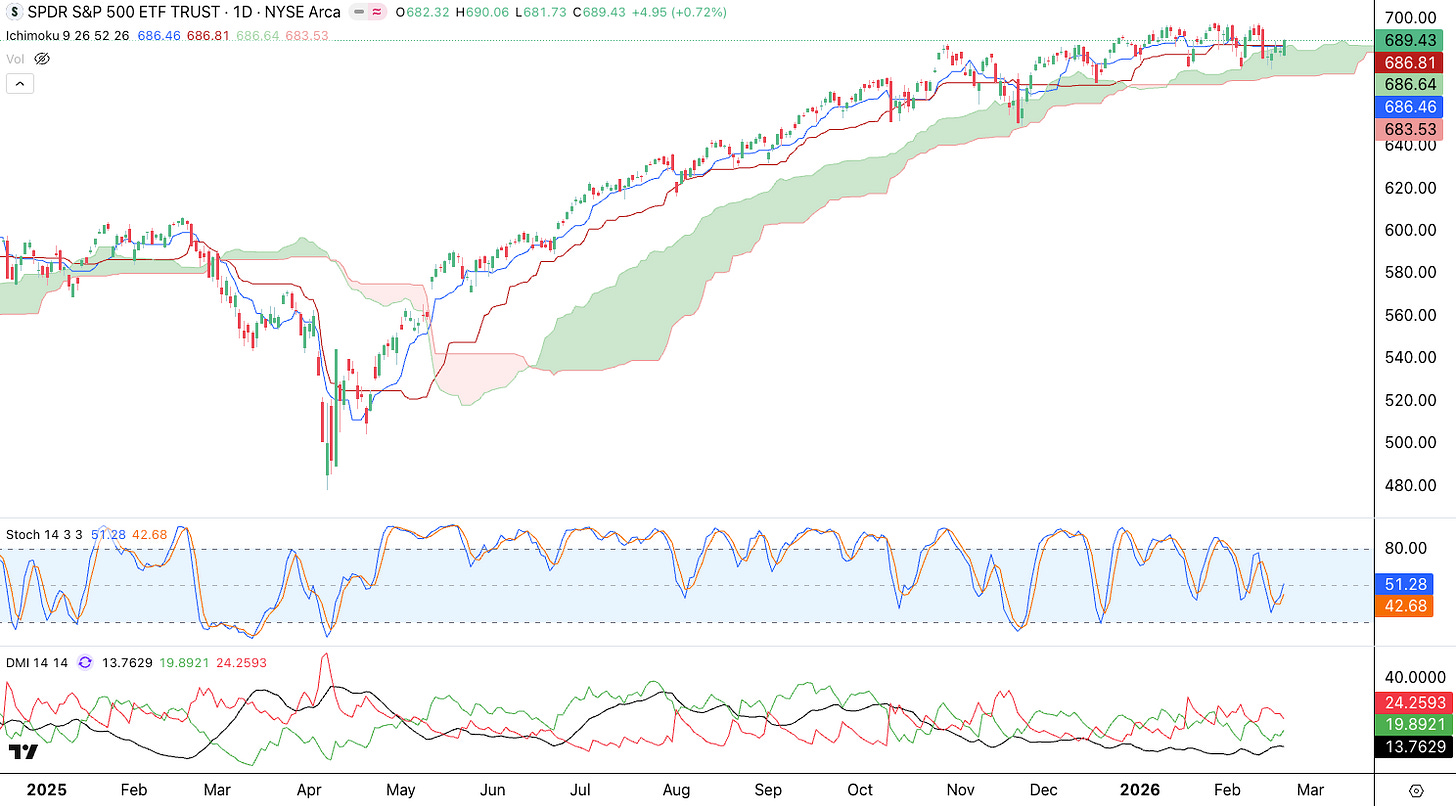 Instructions: The Ichimoku Cloud is a trend framework that shows direction, momentum, and key support or resistance in one view. The conversion line (blue) reflects short-term momentum, while the base line (red) tracks the medium-term trend and often acts as dynamic support or resistance. The Cloud (green/red) defines the broader trend regime and provides forward-looking support and resistance. Price above the Cloud signals bullish conditions, below signals bearish conditions, and inside suggests consolidation. Focus on price versus the Cloud for trend direction, the base line for trend health, and the conversion line for short-term momentum. We are also pairing this analysis with the Directional Movement Index or “DMI (https://www.investopedia.com/terms/d/dmi.asp).