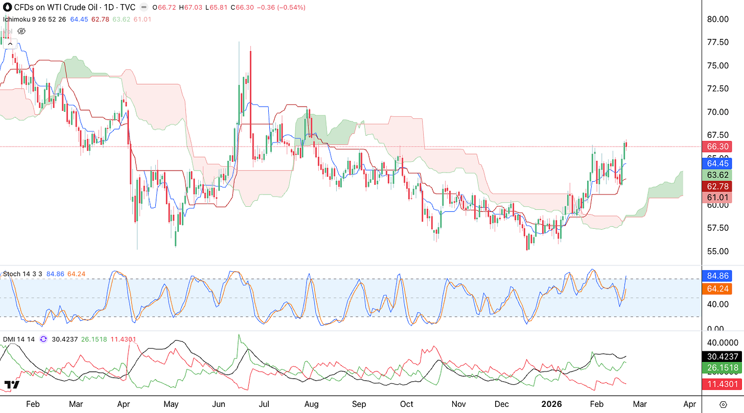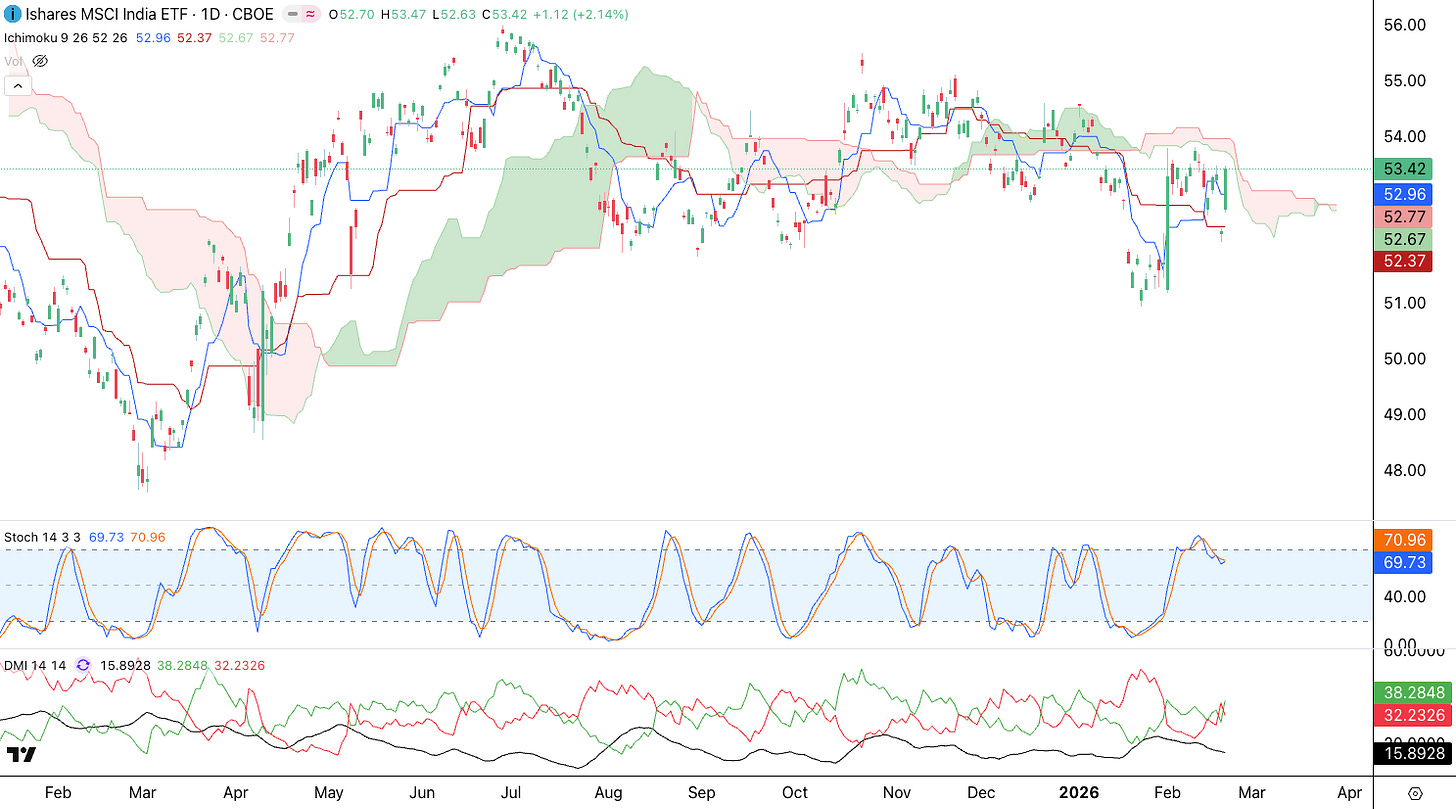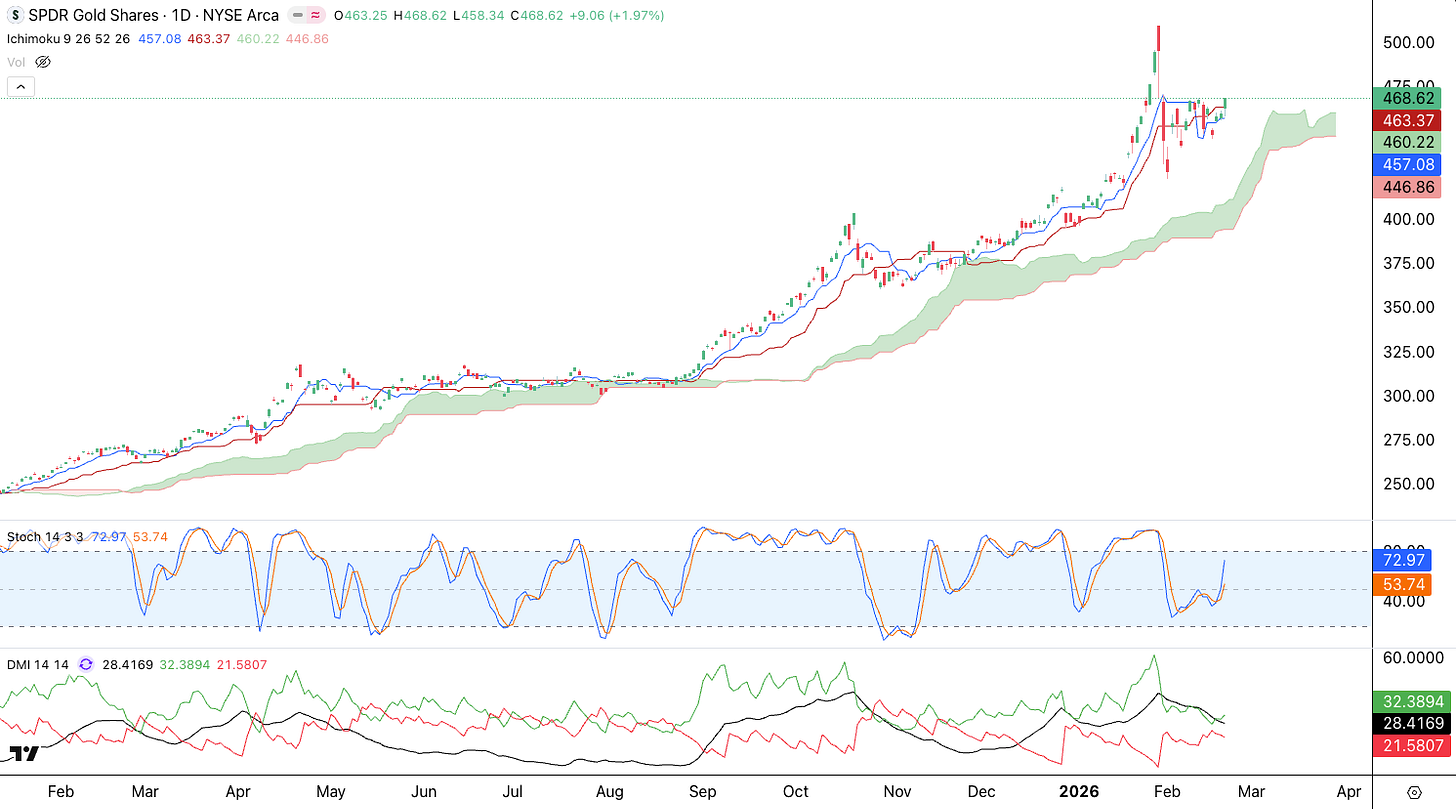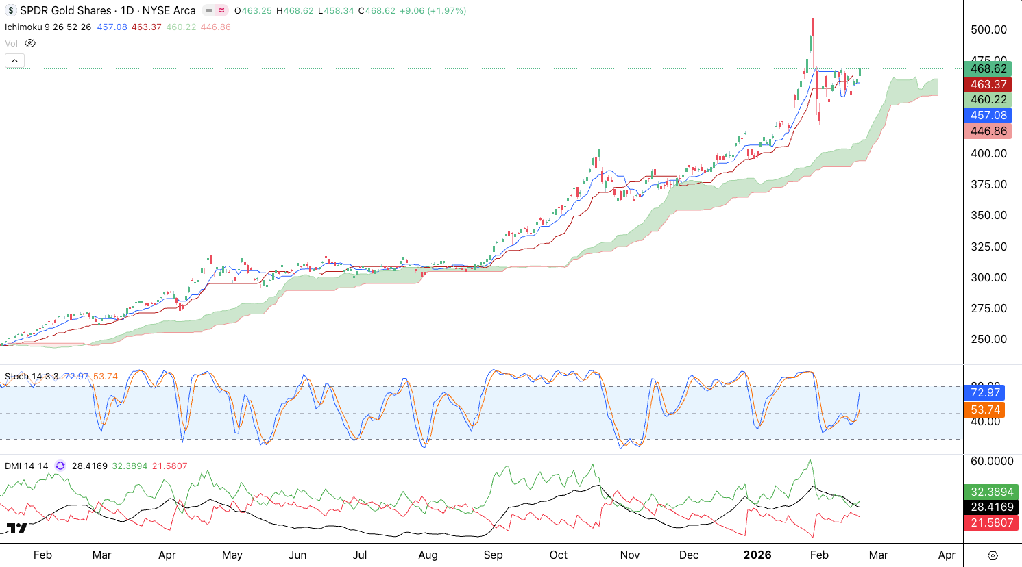 Instructions: The Ichimoku Cloud is a trend framework that shows direction, momentum, and key support or resistance in one view. The conversion line (blue) reflects short-term momentum, while the base line (red) tracks the medium-term trend and often acts as dynamic support or resistance. The Cloud (green/red) defines the broader trend regime and provides forward-looking support and resistance. Price above the Cloud signals bullish conditions, below signals bearish conditions, and inside suggests consolidation. Focus on price versus the Cloud for trend direction, the base line for trend health, and the conversion line for short-term momentum. We are also pairing this analysis with the Directional Movement Index or “DMI (https://www.investopedia.com/terms/d/dmi.asp).