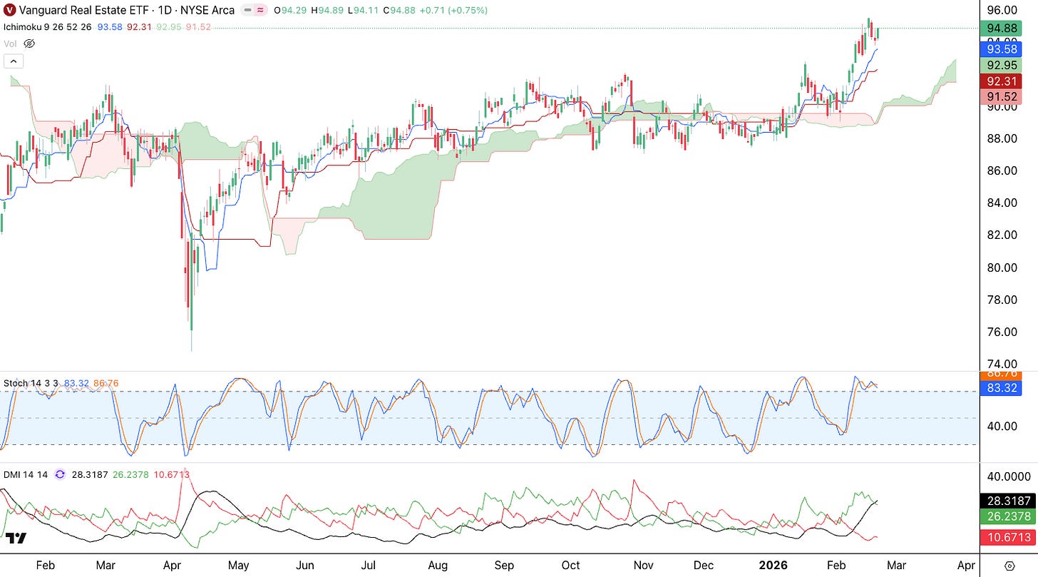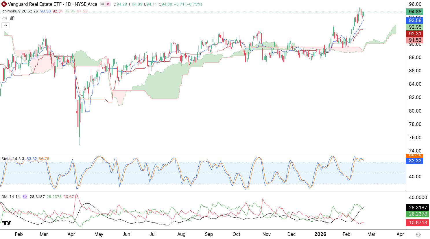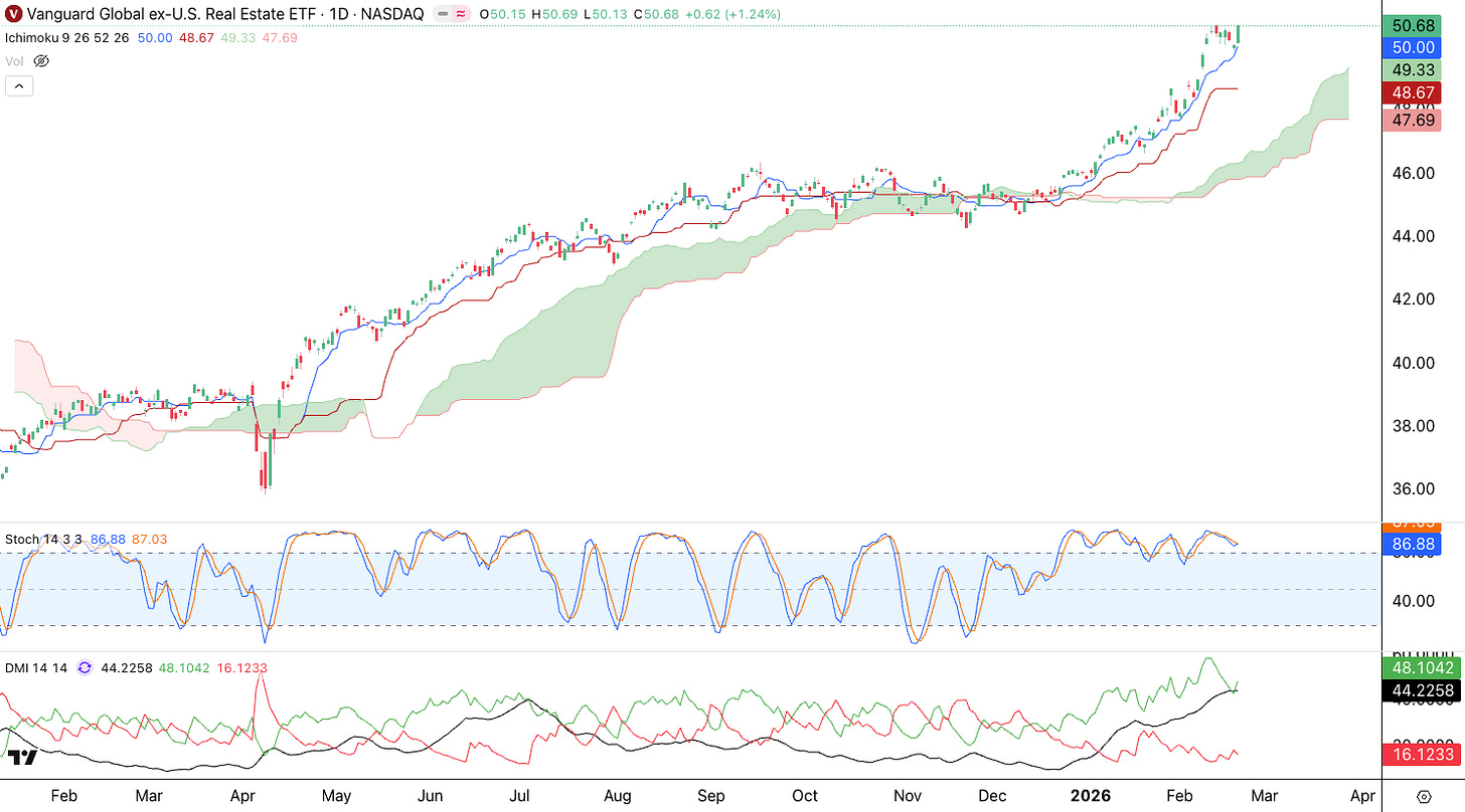 Global Real Estate (VNQI) is on a tear. The DMI tells us this is in a strong uptrend.
