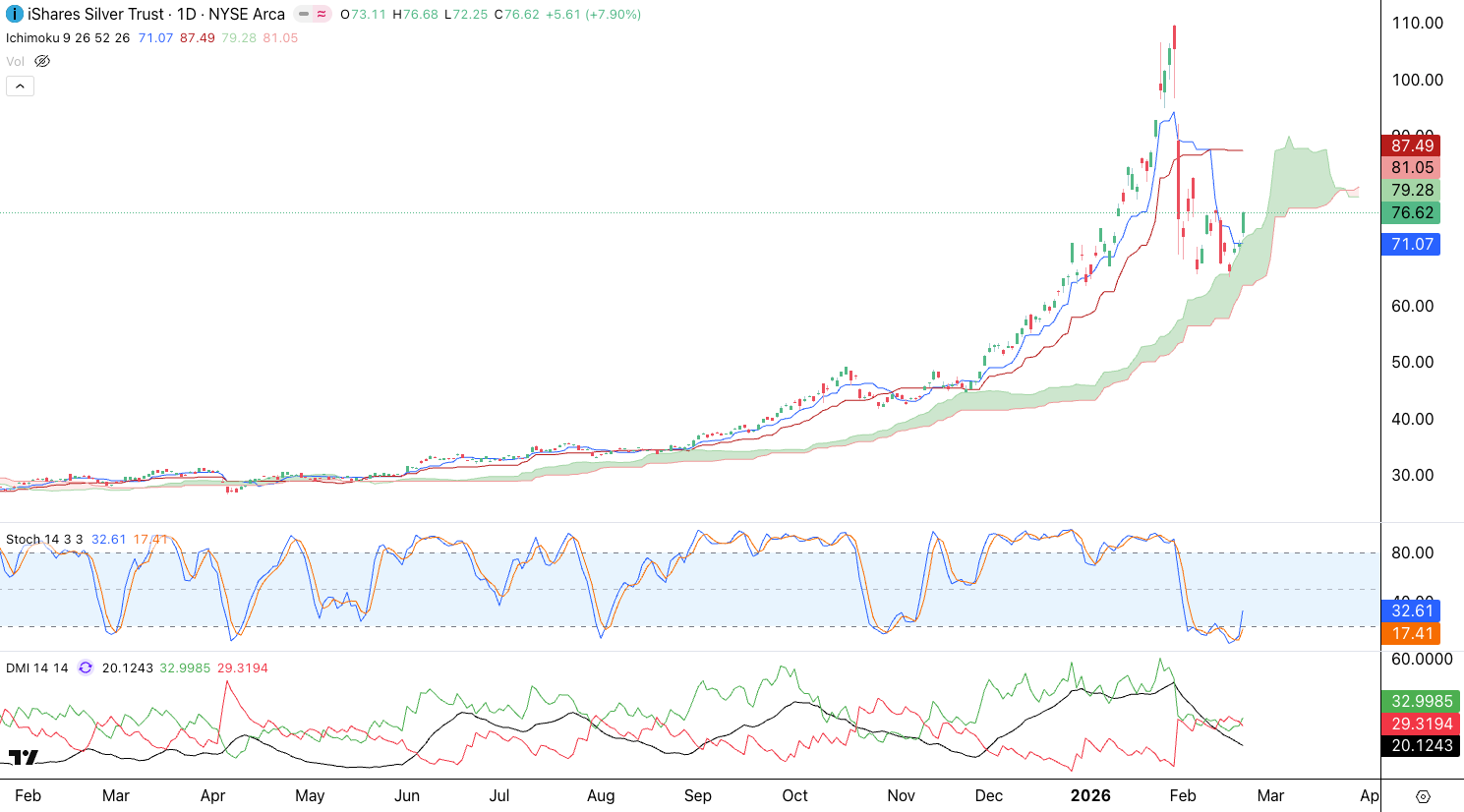 Silver (SLV) bounced off the cloud. The next resistance level is the base line around $87.49. The DMI tells us that the uptrend wants to restart.