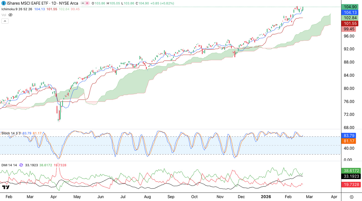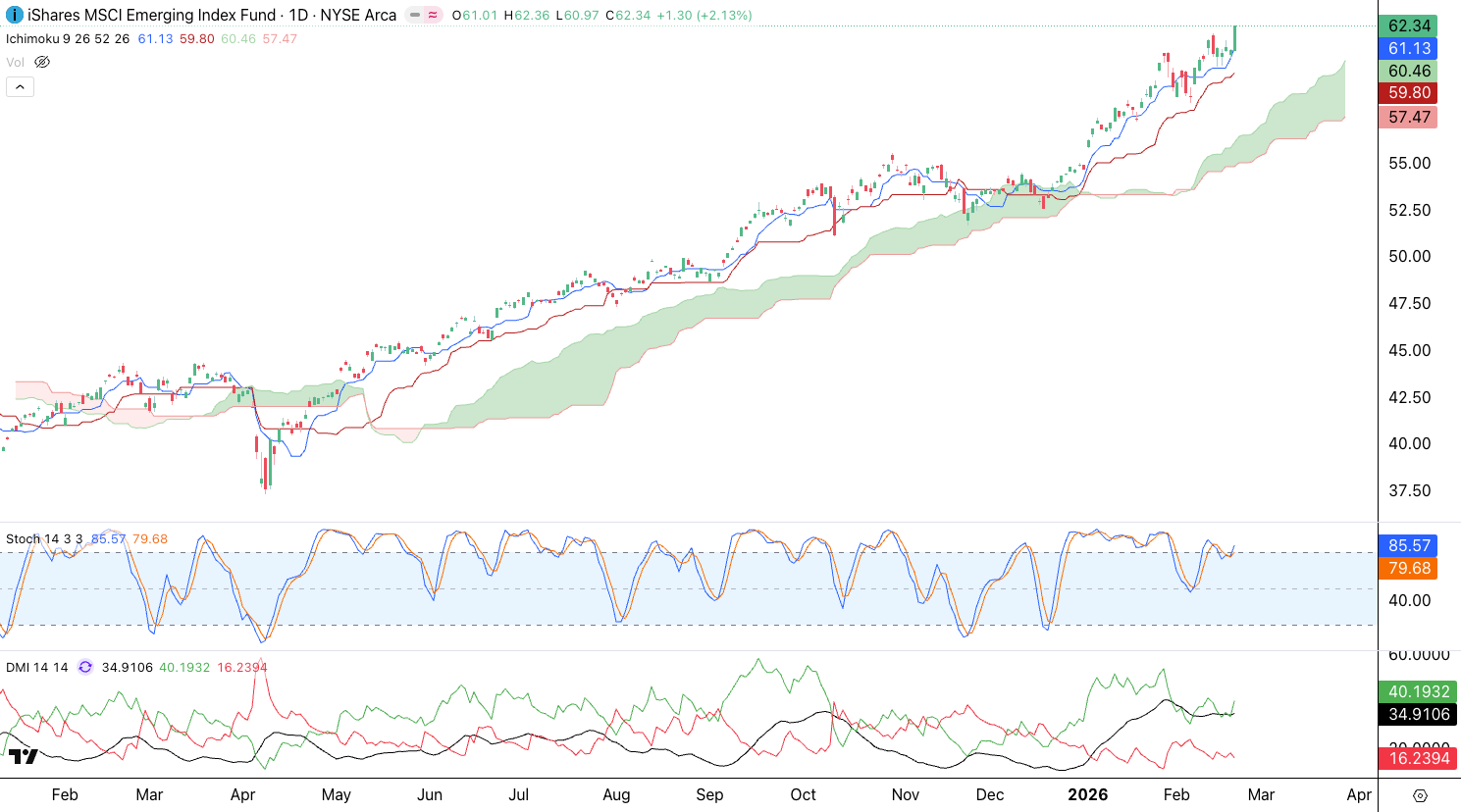 International Developed Markets (EFA), by comparison, is much more bullish. Instead of bouncing off the Cloud, it is extending from the conversion line. This is a winner an investor wants to own. Notice how the DMI is confirming a strong uptrend.