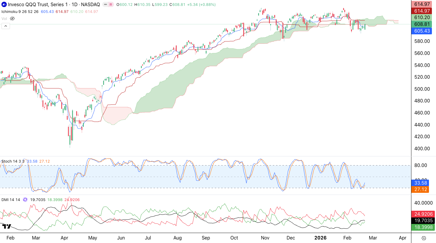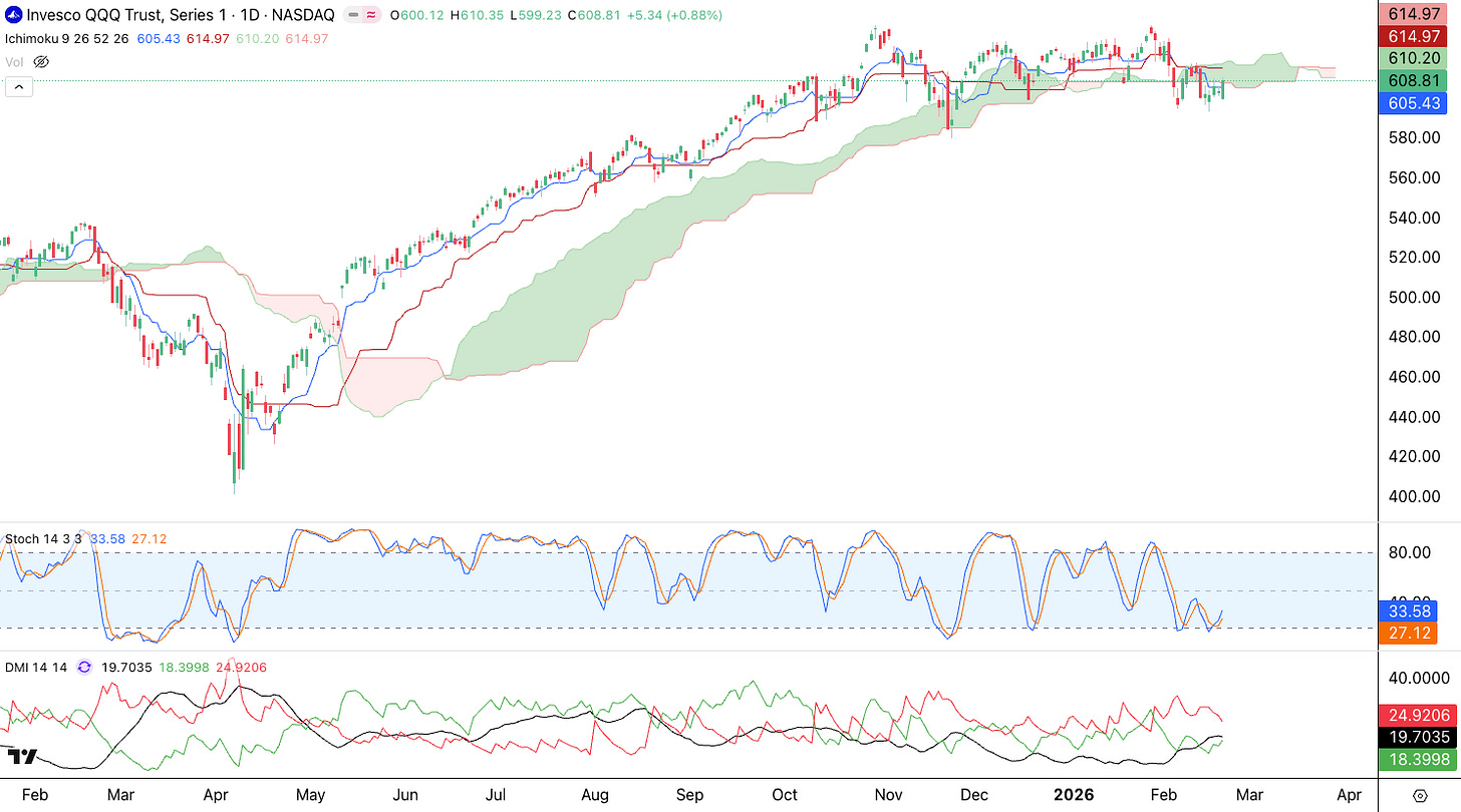 The SPY keeps bouncing off the cloud and refuses to break down right now. Notice how it broke below the cloud in late February 2025 and trended below the base line (red) until the correction was over. Throughout May to October 2025 it held above the base line telling us the medium term trend was strong, however in November 2025 it began breaking the base line, telling us this uptrend is weakening and aging. For now, with the Stochastics making a bullish crossover, expect some upside, however the DMI is still showing a bearish trend, so it has work to do before confirming a new uptrend.