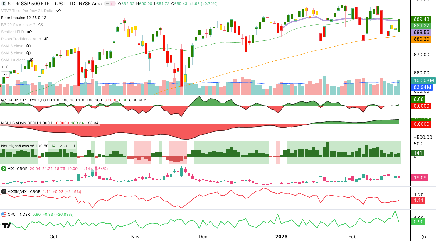 Looking at the chart of the S&P 500 (SPY) below, we can see that as the VIX rolled over and closed below 20, SPY rallied on high volume and completed another successful bounce on the 100 SMA (orange). It closed above the YTD AVWAP (purple) but just below the 30 SMA (green), and a close above the 30 SMA would signal additional strength. The McClellan Oscillator and McClellan Summation Index both show that breadth is strong at the moment, and with Net New Highs remaining persistent, this continues to be a favorable environment for stock traders. The VIX Curve (VXV/VIX) is now in the oversold area, completing a bearish oscillation, and what likely comes next is another uptrend if the VIX Curve continues to trend higher. Finally, the Put/Call Ratio once again shows that when investors crowd into put options, the market often moves in the opposite direction. Overall, this technical picture points to the potential for a new leg higher.