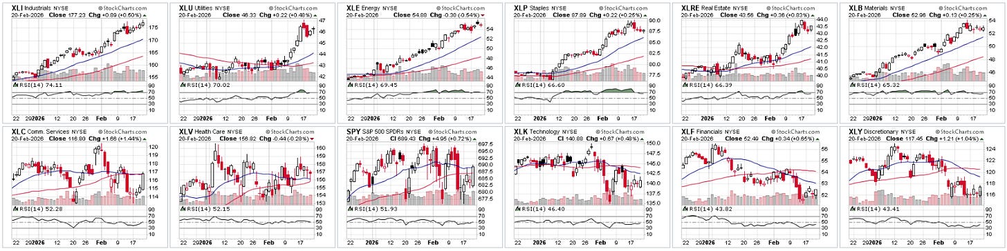 The StockCharts Sector CandleGlance page shows that Industrials (XLI), Utilities (XLU), Energy (XLE), Consumer Staples (XLP), Real Estate (XLRE), and Materials (XLB) are still leading. We are also seeing some new strength in Communications (XLC) and a possible setup in Healthcare (XLV), as price held the 20 SMA (blue) and 50 SMA (red).