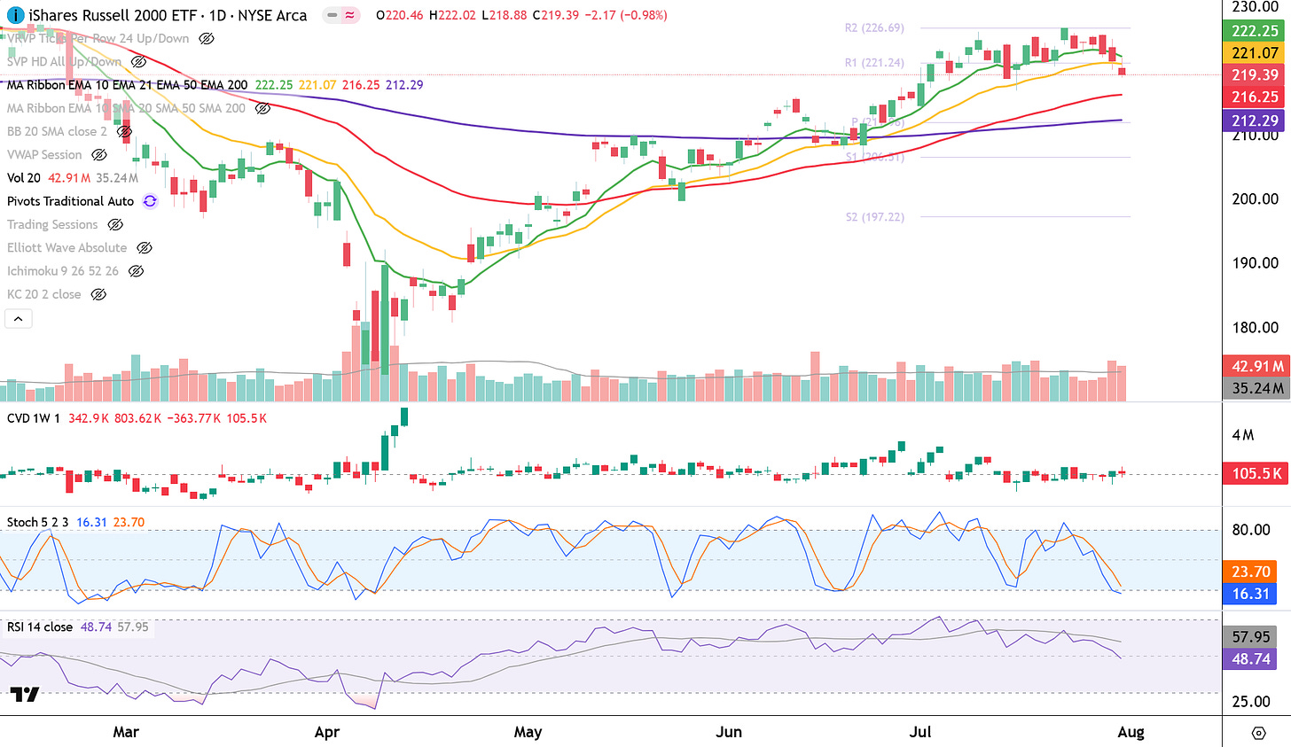 The Russell 2000 (IWM) shows relative weakness as it already fell below the 21 EMA. The next stop could be the 50 EMA at $216 or the 200 EMA at $212.
