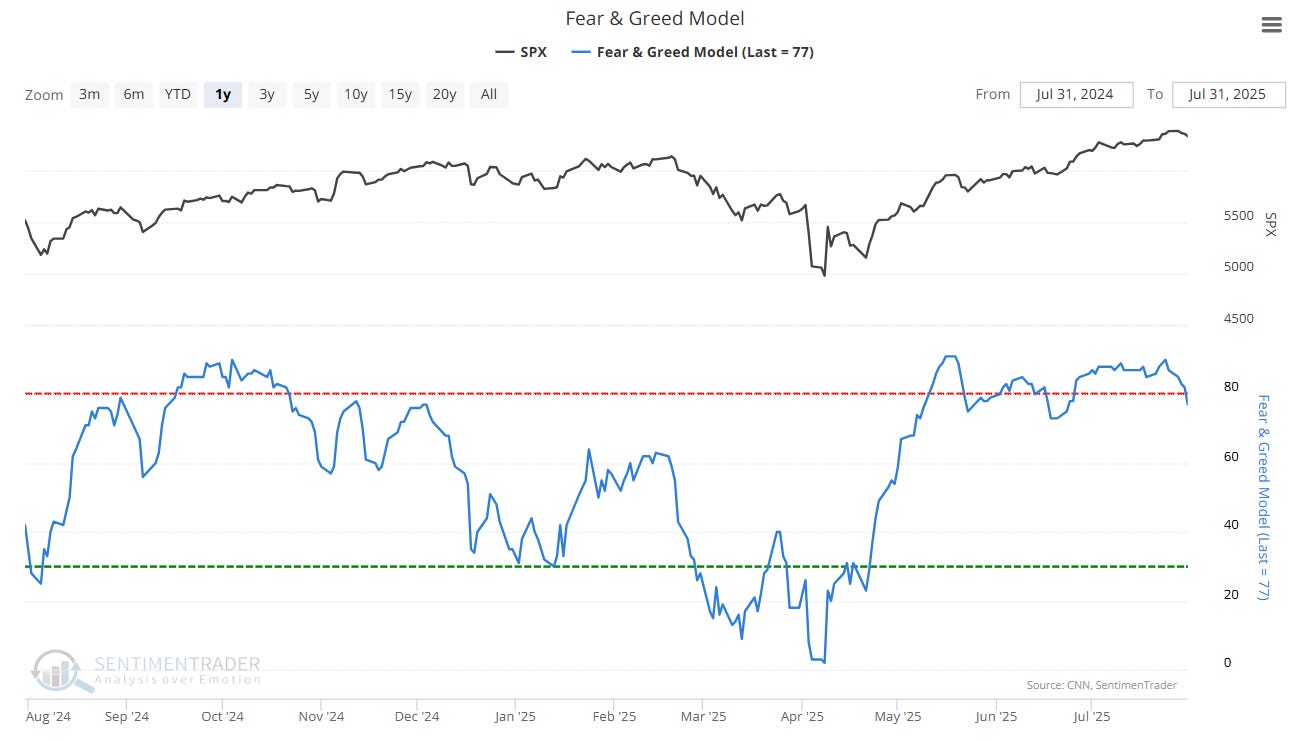 The Fear and Greed Model is finally beginning to dip after grinding sideways in Extreme Greed for about 3 months.