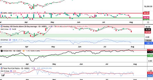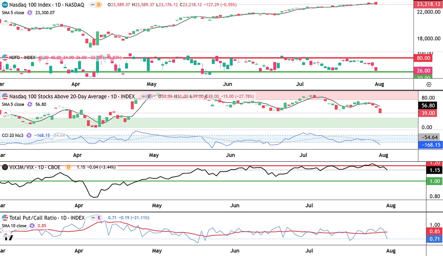 The stock market has shown notable resilience but may now be on the verge of a pullback. Our Market Timer Setup indicates that the Nasdaq 100 (NDX) has slipped below its 5-day SMA (black) as market breadth deteriorates. Both the Nasdaq 100 Stocks Above the 5 SMA (NDFI) and the 20 SMA (NDTW) are trending lower. Meanwhile, the VIX Curve (VXV/VIX) is turning down from an overbought condition, which historically favors downside. Lastly, the Put/Call ratio recently hit a low, signaling that retail traders—fueled by FOMO—are aggressively buying calls in anticipation of more upside. These late-stage buyers are often the first to get washed out, potentially setting the stage for a healthy reset before the next leg higher.