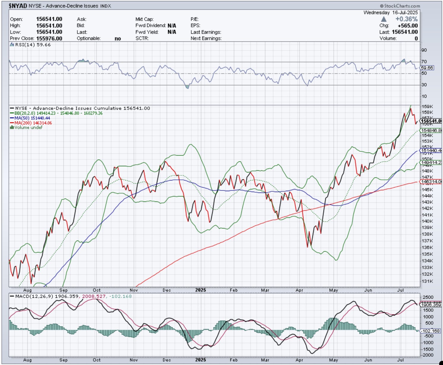 The NYSE Advance/Decline Line ($NYAD) hit the Upper Bollinger Band and is now heading lower as RSI similarly is in a downtrend after a bearish divergence. MACD just made a bearish crossover, so breadth may continue to deteriorate.