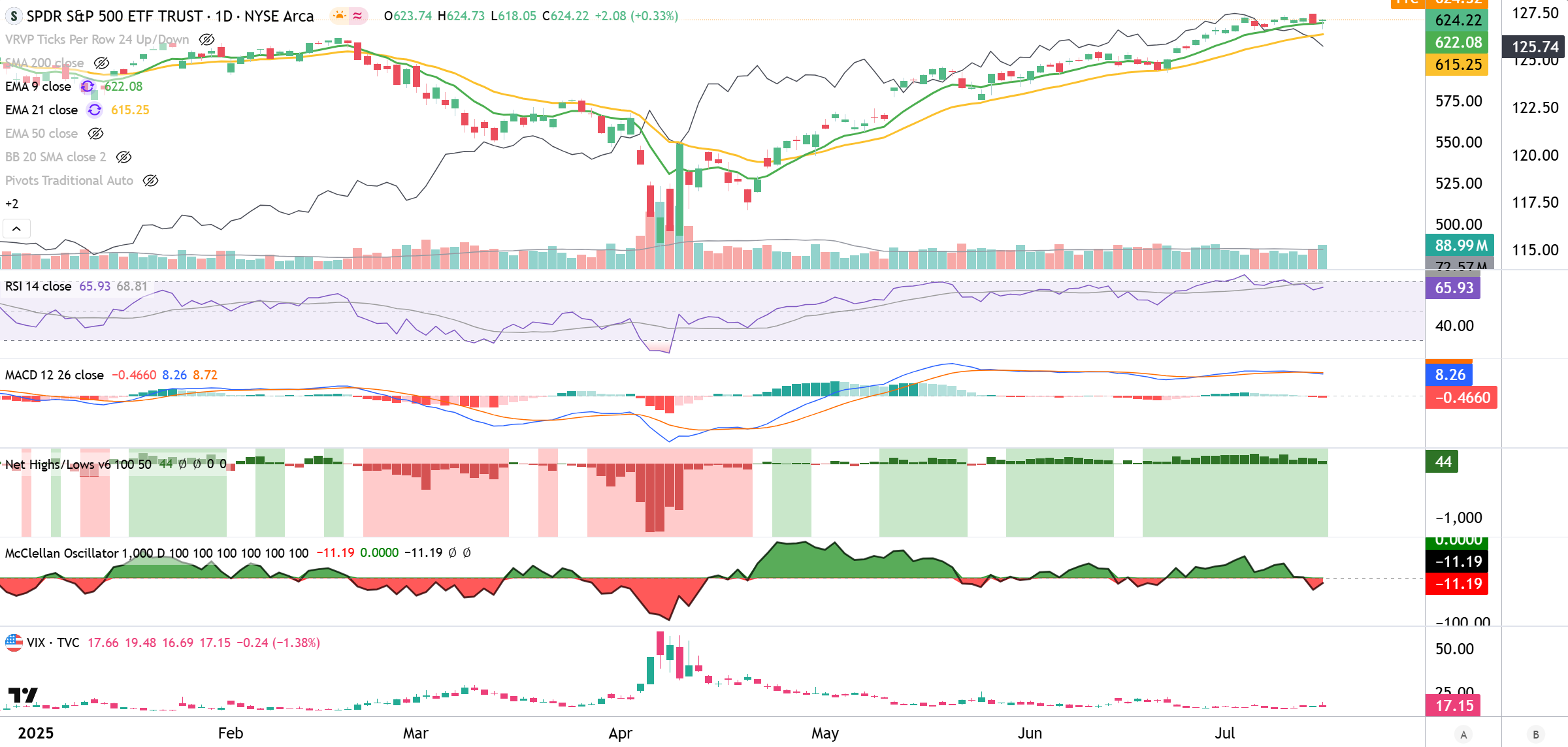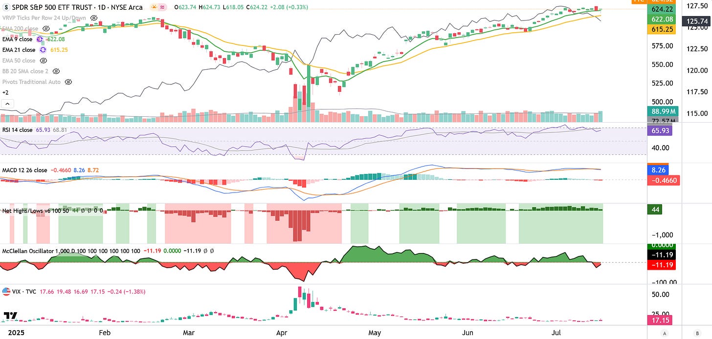 So far, the market has shown resilience in this headline-driven environment. Despite intraday sell-offs, the S&P 500 (SPY) continues to hold above the 9 EMA (green) and 21 EMA (yellow). However, Global Liquidity (black) appears to be declining, which could signal a potential pullback or a sideways consolidation—especially as RSI shows bearish divergence in the overbought territory. Additionally, MACD is reflecting waning bullish momentum. Net New Highs are tapering off, and the McClellan Breadth Oscillator remains negative (though it is beginning to curl upward). For now, the persistently low VIX may be the key factor keeping the market afloat. Technically, unless the SPY breaks below the 21 EMA, this uptrend remains intact.