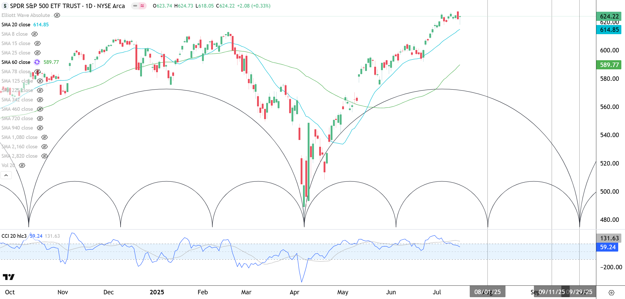 Here’s the key—since this rally began, there has consistently been a pullback around Options Expiration Day (the third Friday of each month). In both May and June, those pullbacks retested the 20 SMA (blue). If this rally is to continue, a pullback to the 20 SMA starting around July 18th (Options Expiration Day) would be perfectly normal. A deeper pullback lasting until the Trading Cycle renews around August 1st is also possible. Importantly, this is the second Trading Cycle within the broader Primary Cycle, and historically, the sharpest corrections occur during the final Trading Cycle—when the Primary Cycle resets. That final phase is expected between September 11th and 29th, suggesting this current pullback should be shallow… unless fundamentals shift and these cycle dynamics take hold…
