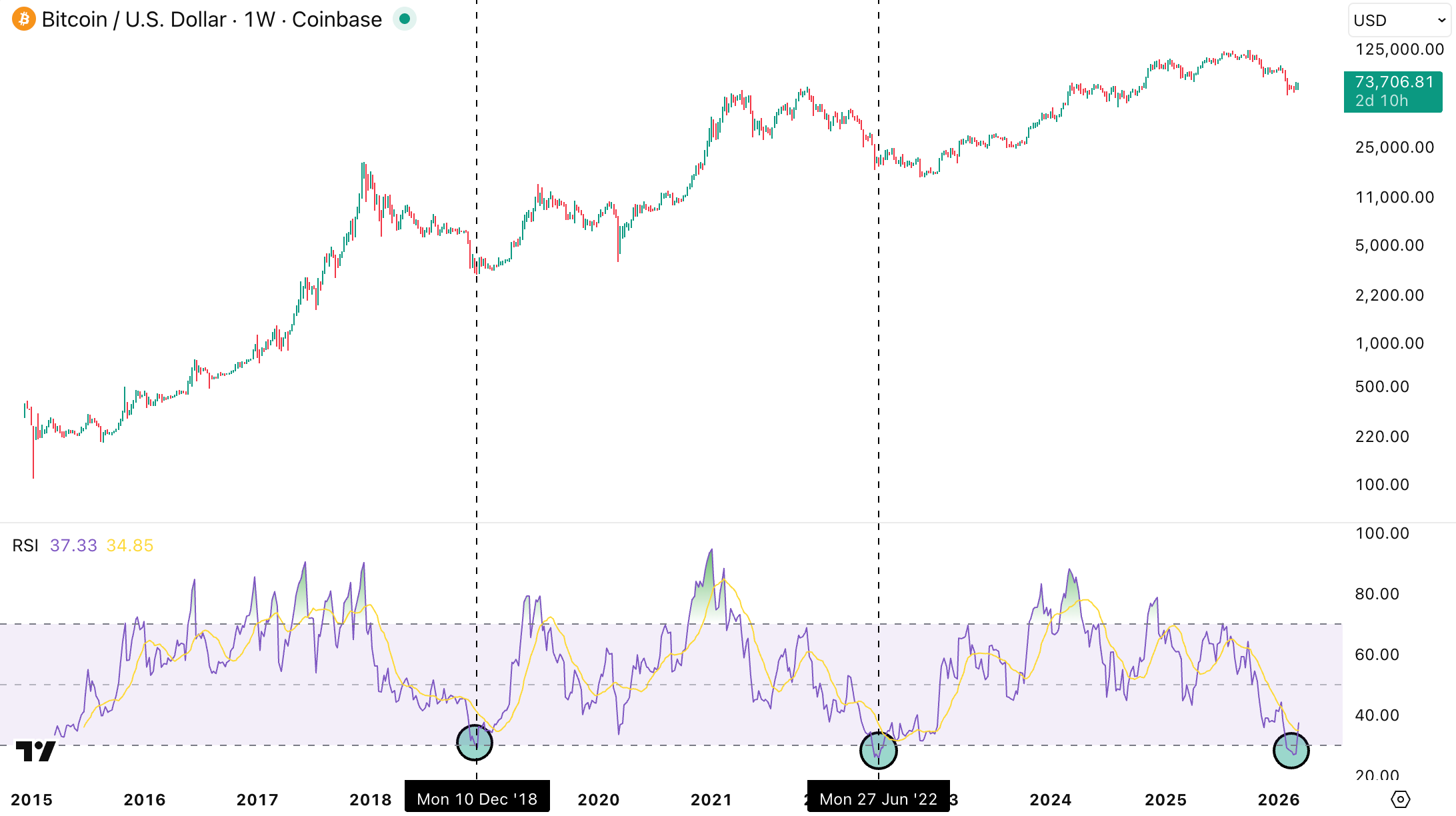 Throughout Bitcoin’s history, major lows have occurred when the asset becomes deeply oversold on higher timeframes.