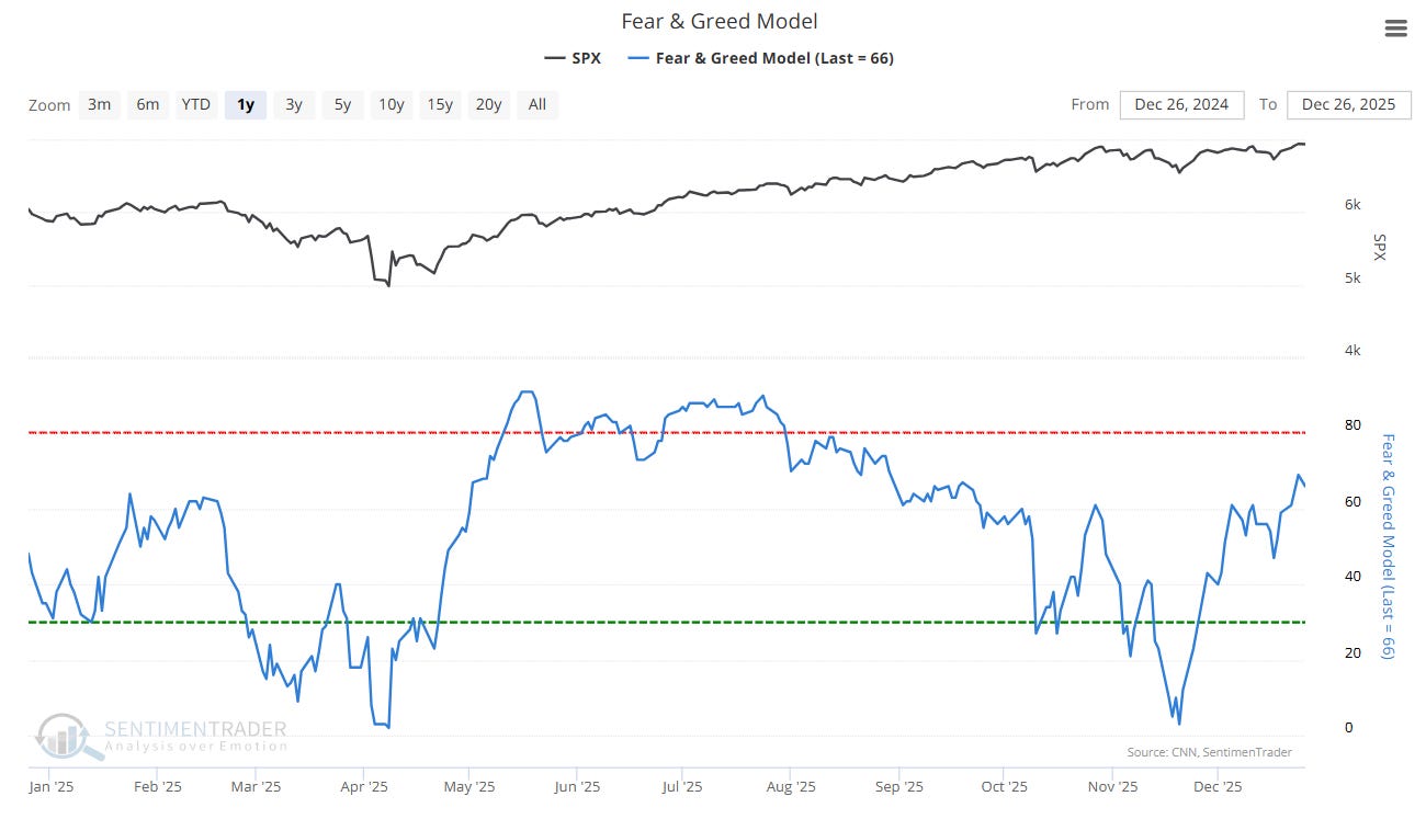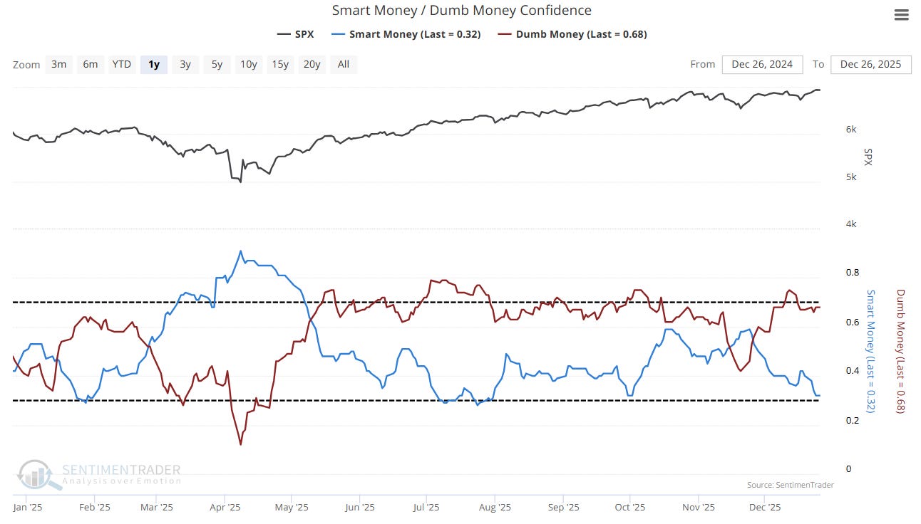 The Smart Money/Dumb Money indicator shows that Smart Money is waiting to buy on a pullback, while Dumb Money is all-in. Should we get an early-January pullback, it could be a buyable one.