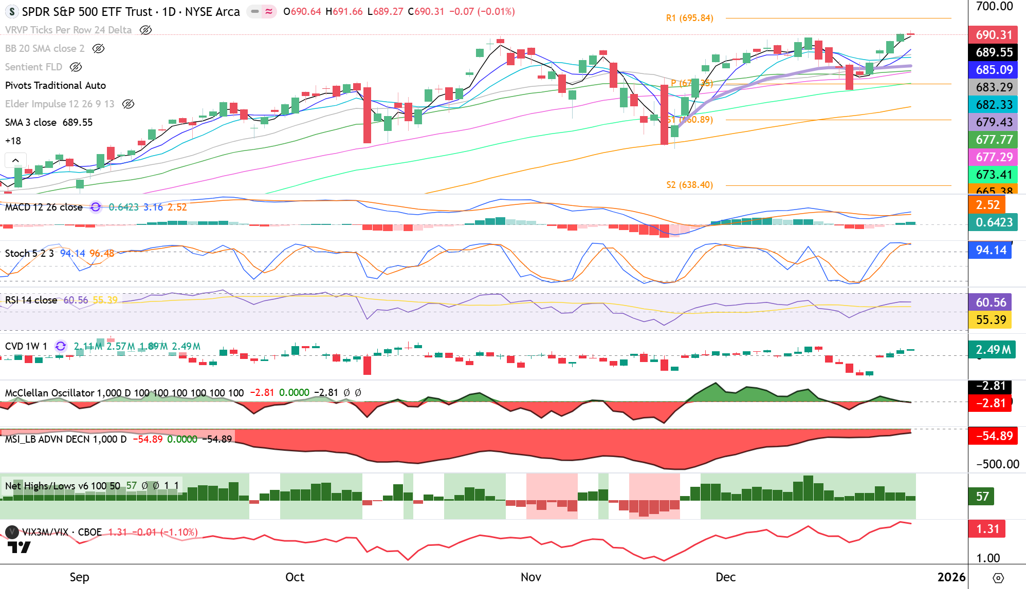 However, the VIX curve is overbought, reinforcing the case for profit-taking. If the market does push higher, the R1 pivot point near $696 could act as a key area of resistance.