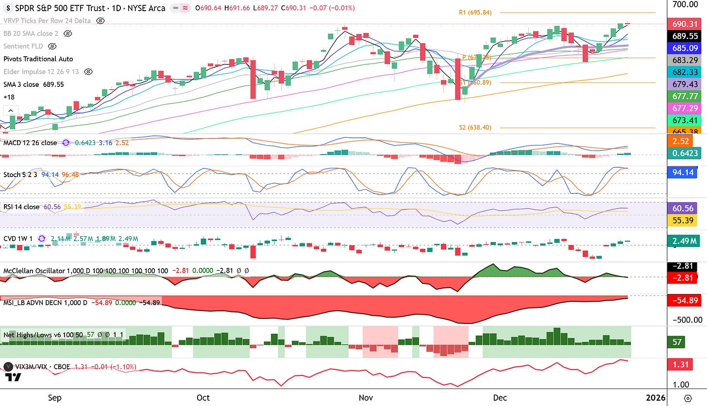 We just had a successful Santa Claus rally, and the SPY is sitting at the high of the year. The upside oscillation is largely complete, and while the market could grind a bit higher on fumes, conditions are lining up for a potential early-January pullback. That move could be driven by investors looking to take profits into the next tax year.