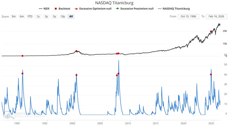 Higher readings on the NASDAQ Titanicburg signal unfavorable market conditions, while lower values are considered more favorable.