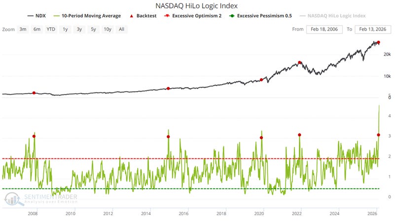 The chart below highlights all dates when the 10-day average of the Nasdaq HiLo Logic Index crossed above 3.