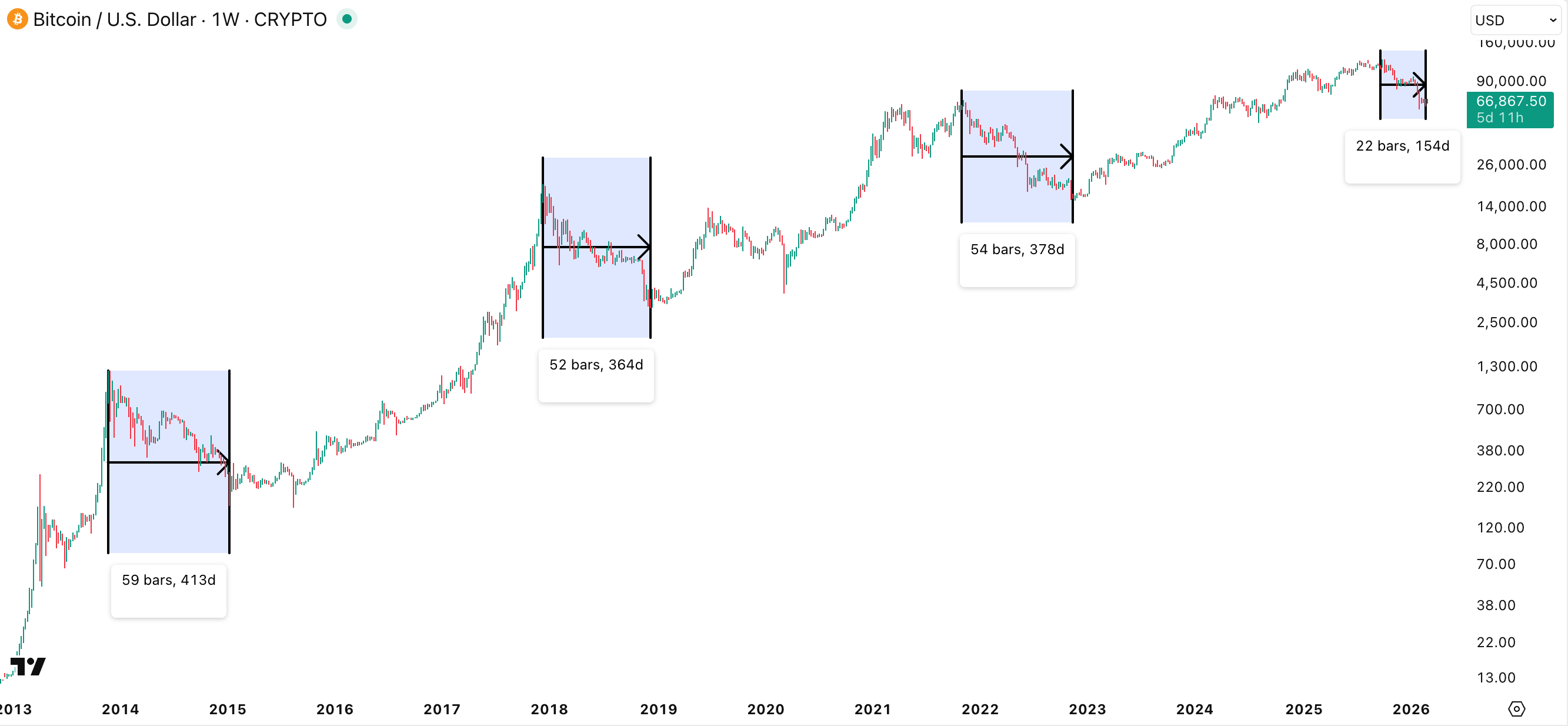 Now bears might argue that based on the well-known “4-year Cycle” for Bitcoin, we’re only about halfway through the correction and there’s still 30 odd weeks left before Bitcoin actually bottoms.