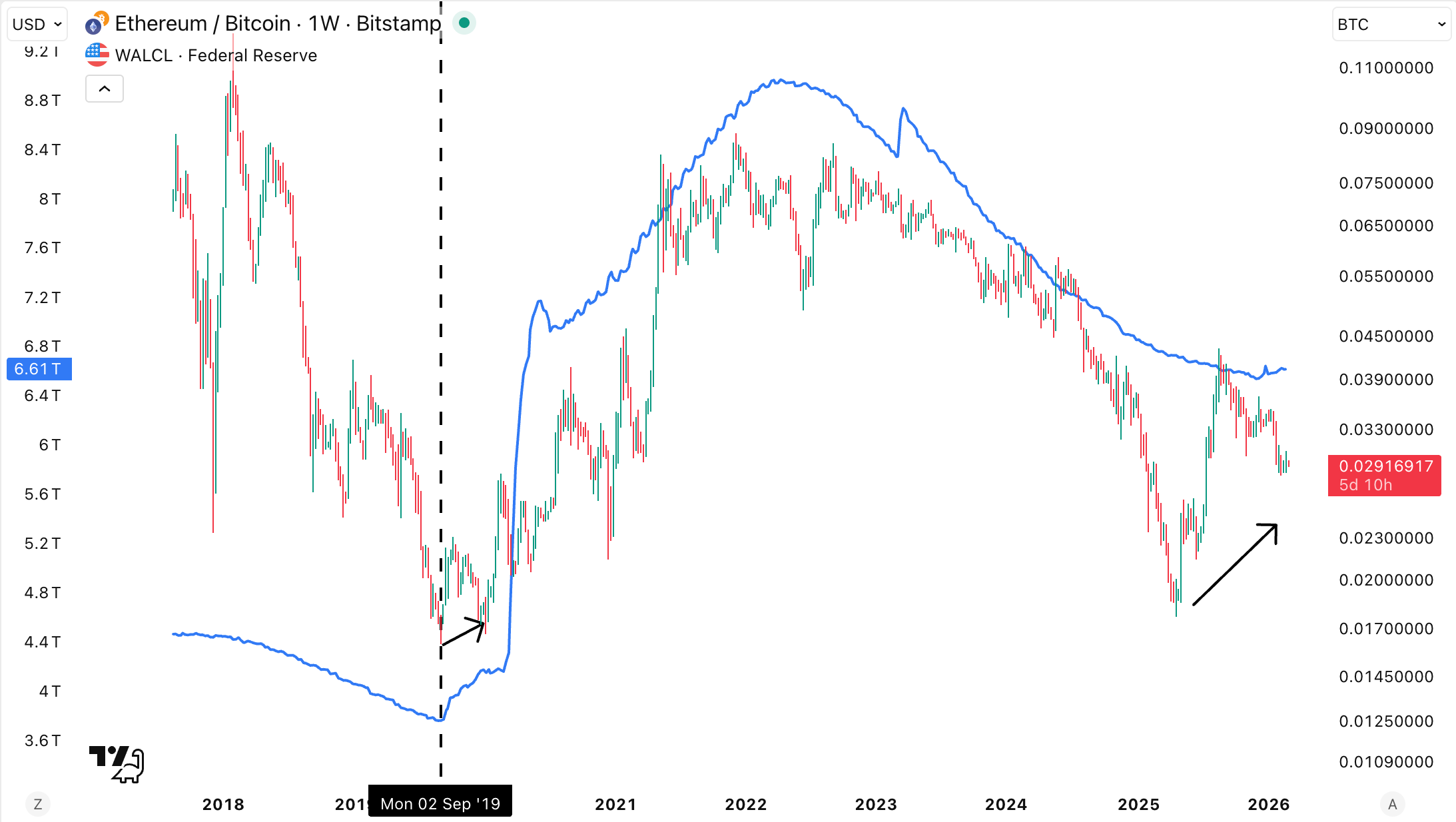 Back in 2019, when the Fed pivoted from contracting their balance sheet to gradually (and then rapidly) expanding it, the transition marked the turning point for the Ethereum/Bitcoin ratio.