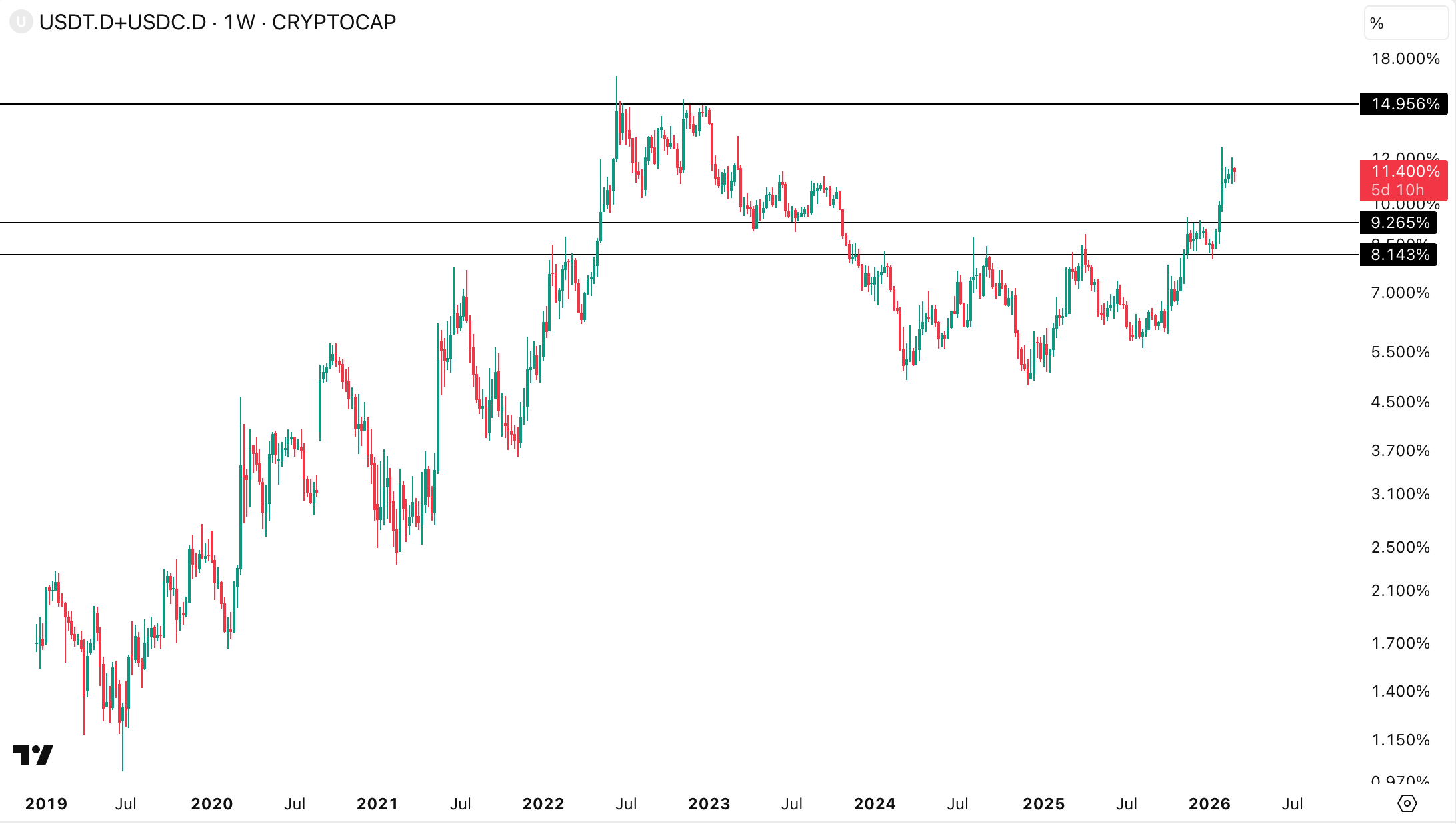 One reason we don’t think the broader correction is completely over yet is to with this chart showing the stablecoin dominance (for USDT and USDC).