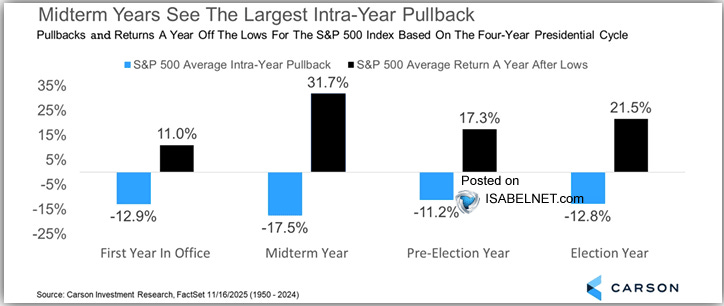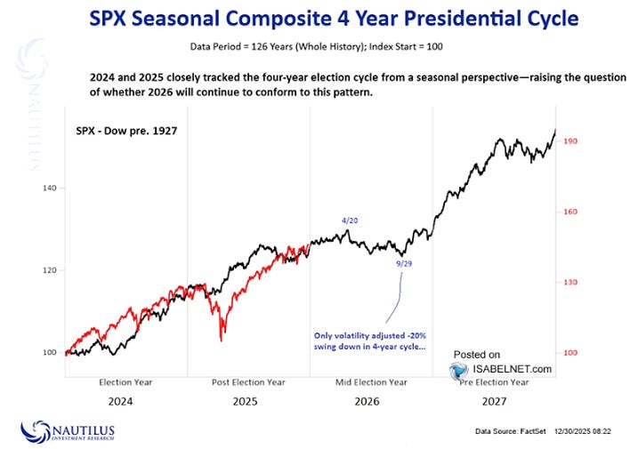 We can expect volatility in 2026. Looking at the 4-Year Presidential Cycle, Midterm Election Years tend to bring the highest degree of downside volatility with a statistical peak around April 20th and trough around September 29th.